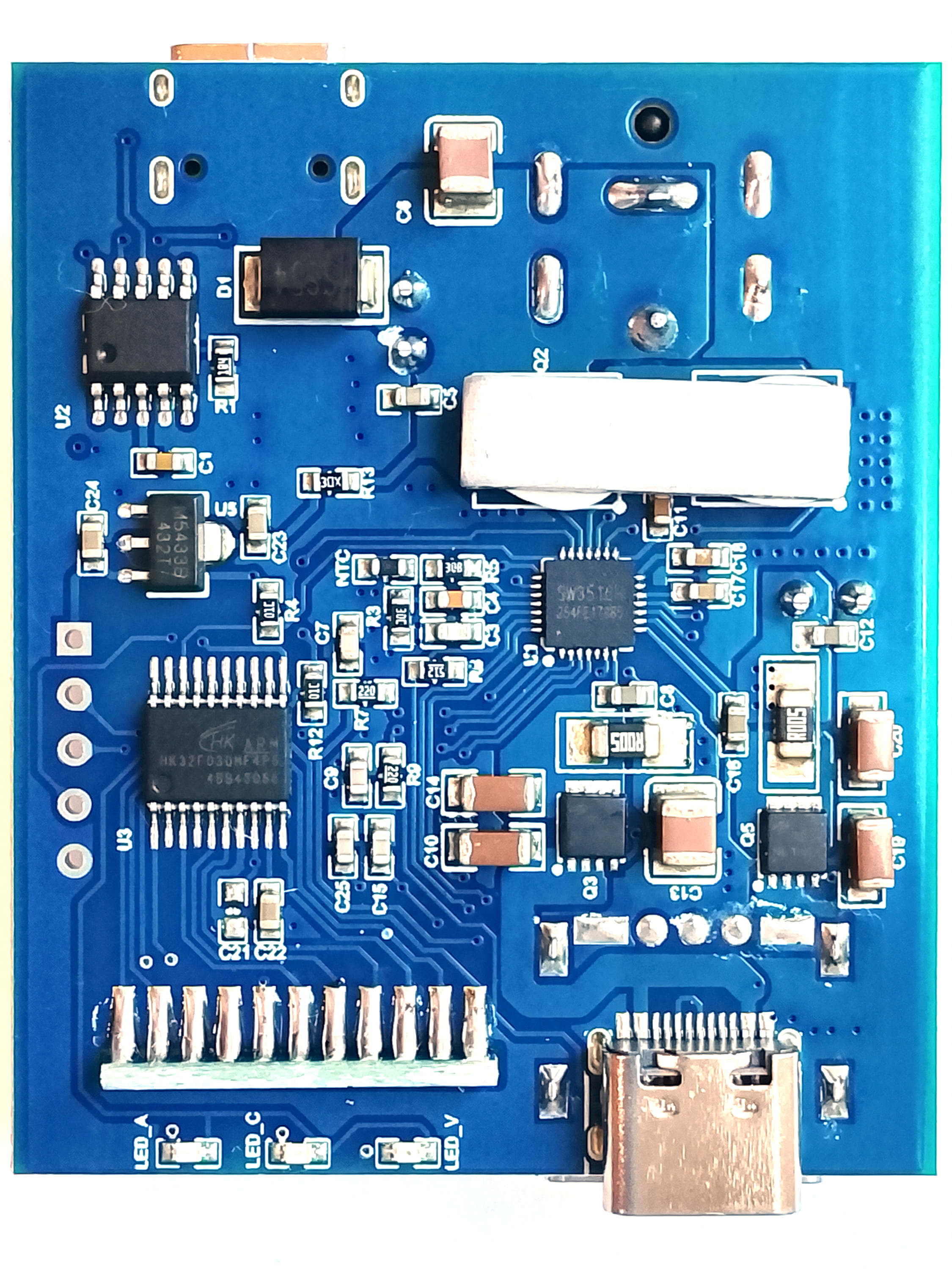 Маркировка читается у 32-битного микроконтроллера ARM HK32F030MF4P6 и собственно чипа 100-ваттной зарядки SW3518S. Напротив USB разъёмов стоят MOSFET-ы Q3 и Q5, которые в случае каких-то эксцессов отключают выходные порты от электрических цепей. Это элементы защиты, тут она есть.