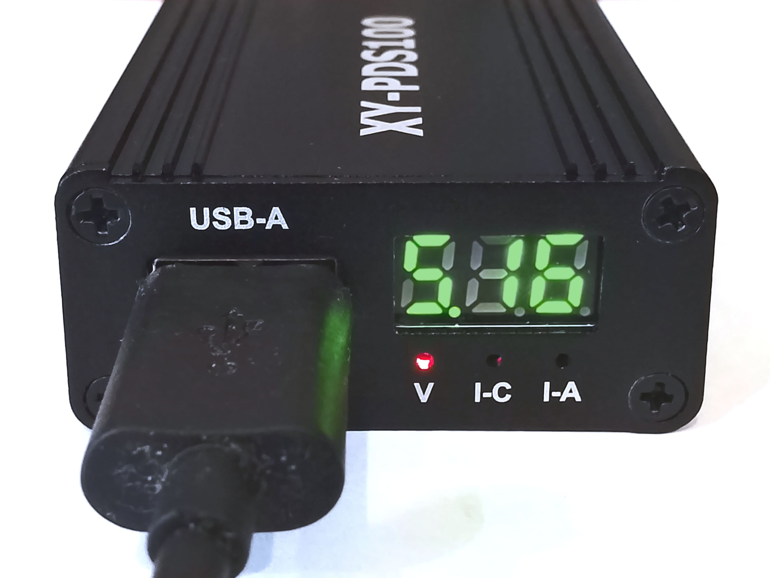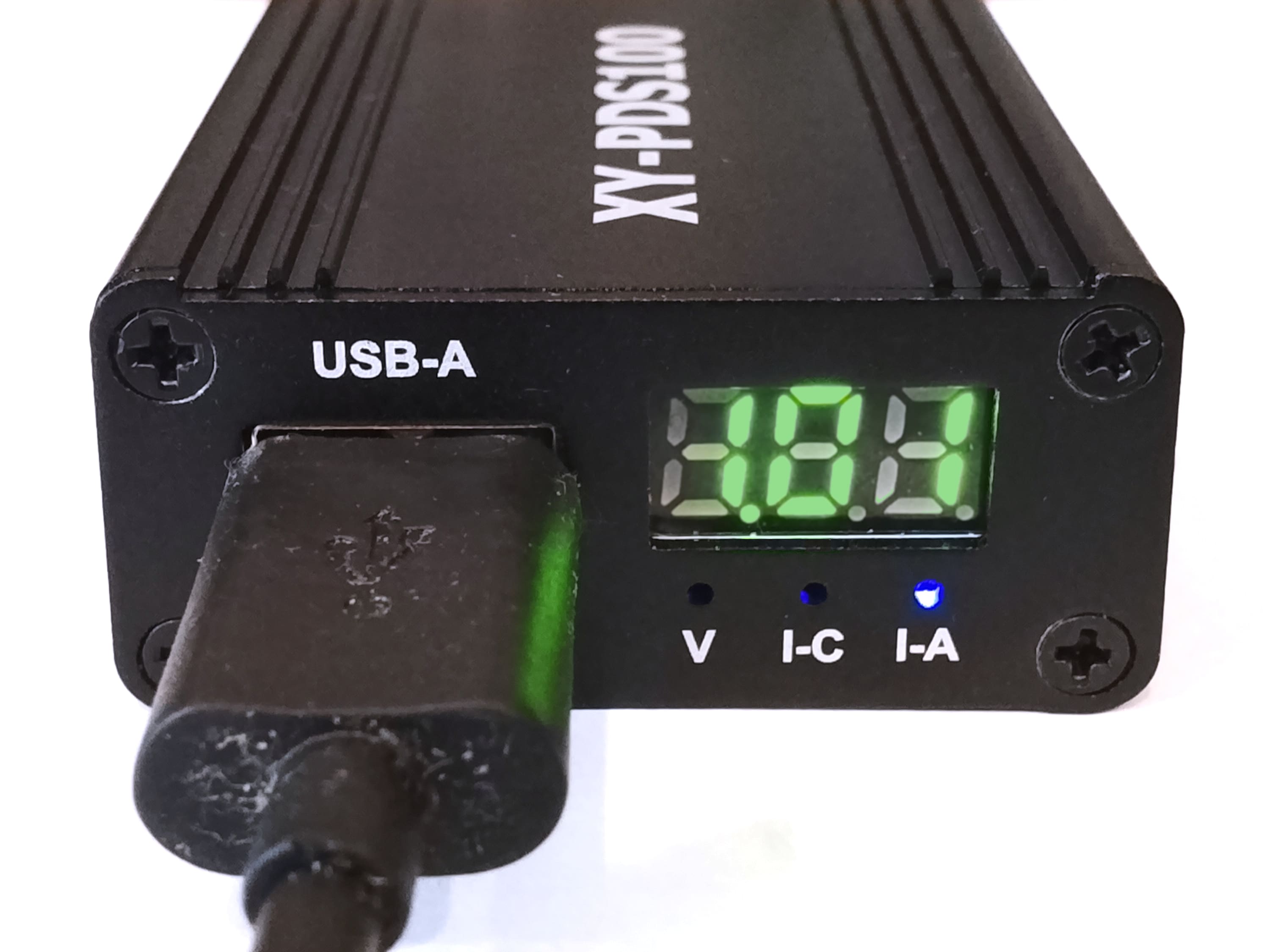При подключении к нему устройства, с которым можно договариваться про протокол, дисплей на пару секунд показывает идентификатор протокола (например, «pd2»). При безоблачном небе на широте N54° указанный протокол выдал 5.24 V при токе 2.30 А. При изменении освещённости ток может уменьшаться, но без сброса протокола.
