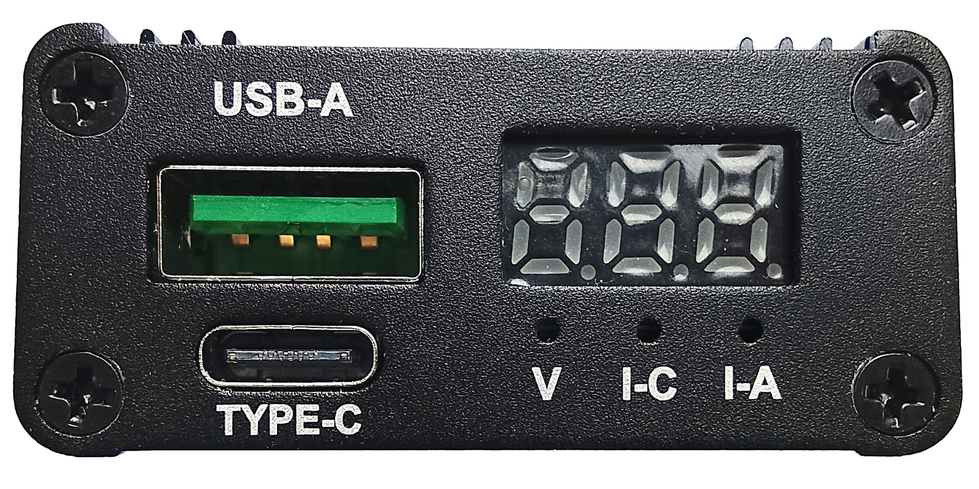 Морда девайса тоже незатейлива - выходные порты USB-A и Type-C, плюс индикатор. Как видим, на LED дисплее при запайке транспортировочную плёнку не отрывают, так что там будут пузыри и блики при работе.